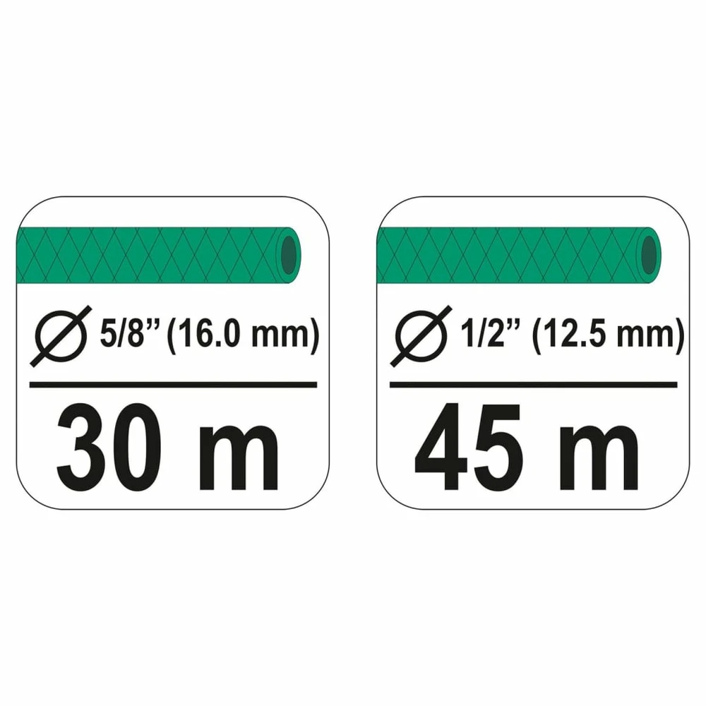 - adapté à un tuyau de 1/2″ d’une longueur de 45 m et un tuyau de 5/8″ d’une longueur de 30 m
