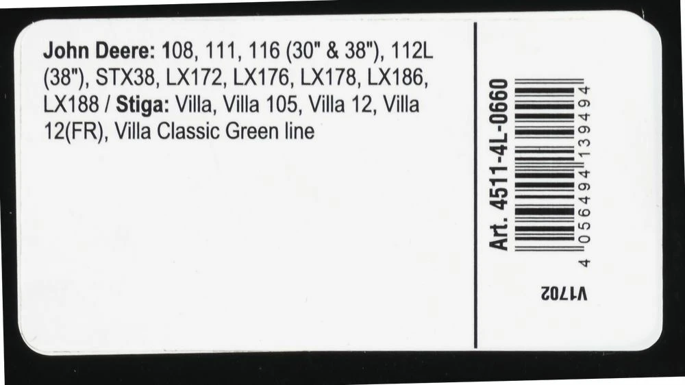 | john deere | m82460 m82462 m82464 | 108, 111, 111h, 112l, 116, 116h, 130, 160, 165, 170, 175, 180, 185, 240, 245, 260, 265, 285, 320, gt242, gt262, gt275, lx172, lx173, lx176, lx178, lx186, lx188, stx30, stx38, 38″ » |