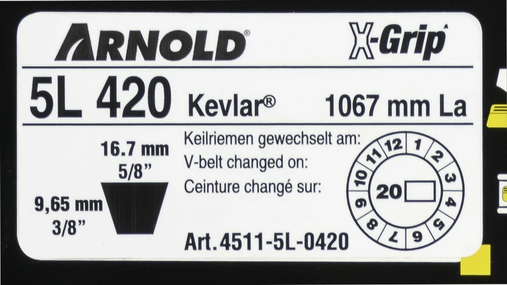 courroie arnold x-grip sont spécialement conçues pour autoportée et tracteur de jardin. Les courroies x-grip ont une haute résistance à l’huile, à la chaleur et aux fissures. Sa composition en fibre et sa couche de kevlar lui confère une grande résistance à la traction, sans torsion, et aux chocs. L’emballage de la courroie donne une haute résistance à l’usure et réduit le glissement à l’embrayage. Les courroies arnold x-grip résiste à un haut niveau de torsion.