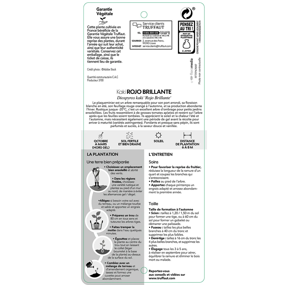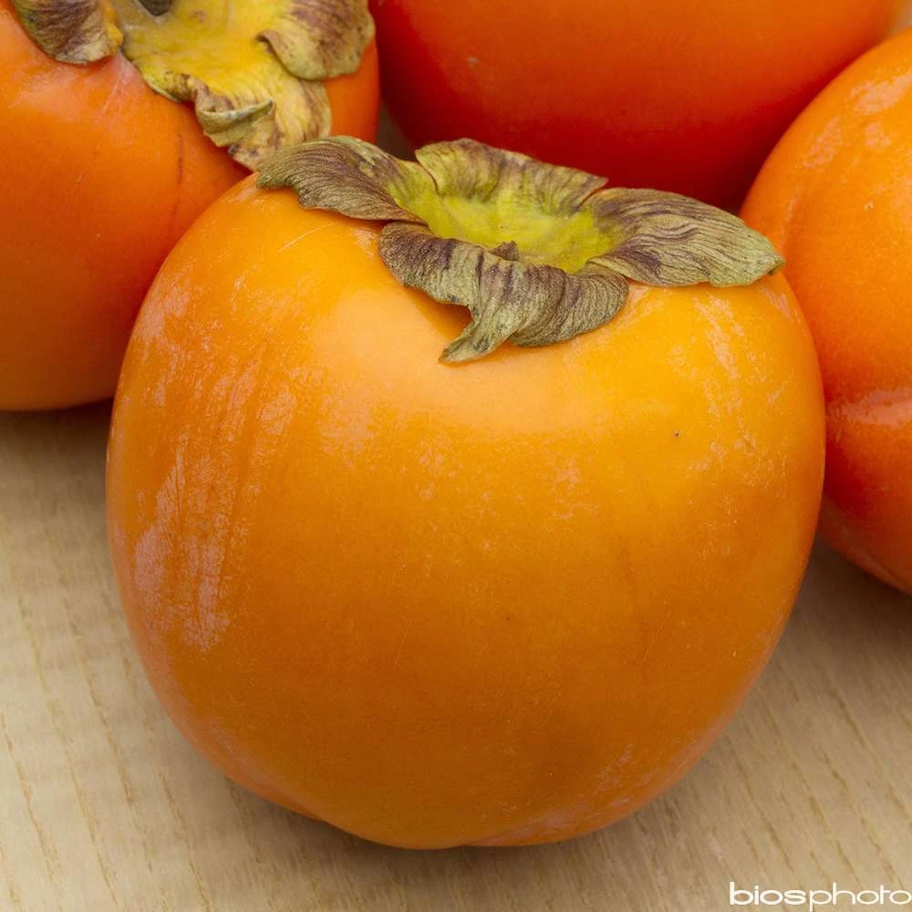 Le genre Diospyros comprend environ 450 espèces originaires des régions chaudes dont principalement l’Indonésie. Diospyros kaki (Plaqueminier ou Kaki) est l’une de ces espèces, originaire de Chine. Ce petit arbre, à cime compacte arrondie, atteint 7 m de hauteur pour une largeur de 4 m. Feuillage caduc, vert foncé, brillant dessus, plus clair et mat dessous. Belles colorations en automne, orange et pourpre. Floraison blanc jaunâtre en mai-juin. Fruits globuleux, ressemblants à une tomate, jaune à rouge orangé brillant, en octobre-novembre. A planter dans un sol profond et fertile, en situation ensoleillée et chaude, bien abritée dans les régions à hivers rigoureux. Ne nécessite aucune taille. Le Kaki « rouge billant » est un grand plaqueminier très productif, aux gros fruits légèrement aplatis, jaunes virant au rouge à maturité. Pulpe jaune orangé à grande qualité gustative. Astringent, il se consomme blet en décembre. Rustique à -20°C.