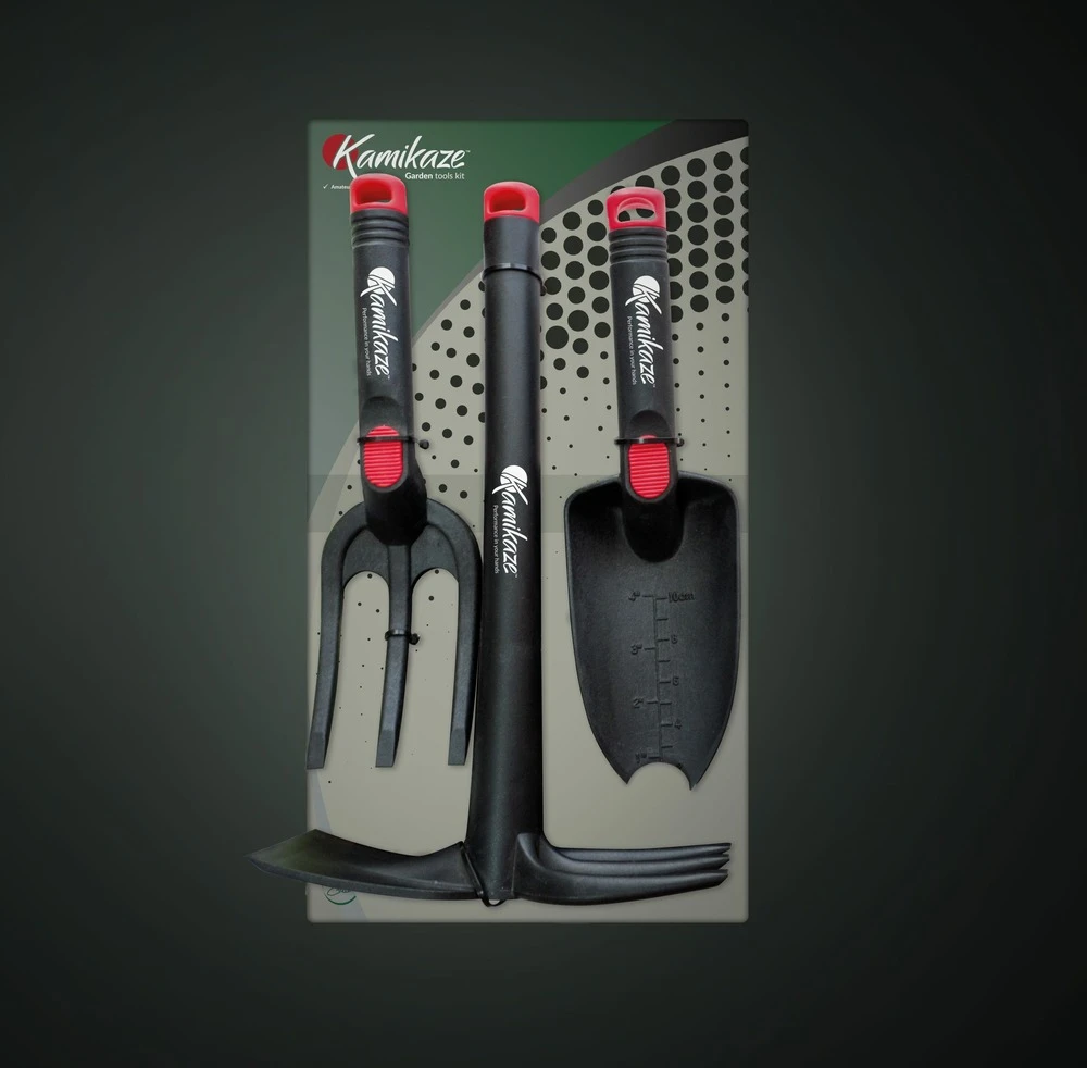 Inclut un râteau à 5 dents, une large bêche de repiquage et une houe à fourche à 3 dents.
