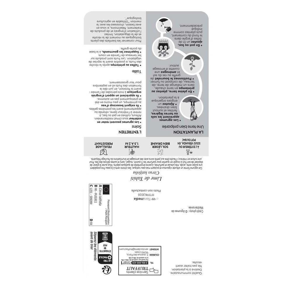 La Lime ‘De Tahiti’ forme très vite un arbuste vigoureux et puissant. Ses fruits ressemblent à s’y méprendre à ceux d’un citron. Mais que l’on ne s’y trompe pas : il s’agit bien d’un citron vert, cet agrume évocateur des Ti-punch, rougail, carry et autres délices des îles. Cette variété de lime offre des fruits à la peau fine et à la pulpe verte, acide , très juteuse et parfumée, à peine encombrée de quelques pépins. Il est possible de cultiver la lime ‘De Tahiti’ en intérieur, mais il faudra alors être aux petits soins pour l’arbuste en arrosant très fréquemment la motte et en brumisant régulièrement les feuilles.