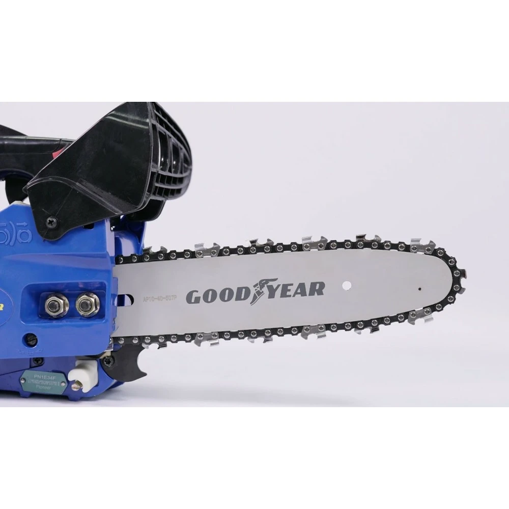la tronçonneuse élagueuse thermique goodyear gy25cs 2 temps est robuste, légère, fiable et parfaitement équipée. Son système de lubrification automatique de la chaine offre une qualité de coupe parfaite et un confort de travail appréciable. Son faible poids de 3.5kg et sa poignée soft grip vous permet de travailler d’une seul main. Idéal pour les travaux d’élagage et débroussaillage de branches. Son moteur 2 temps d’une cylindrée de 25.4 cm3 est facile à démarrer grâce à son système easy start. Pompe à huile réglable, chaine de recul et frein mécanique. Maillons 3/8 lp. Harnais et accessoires inclus.