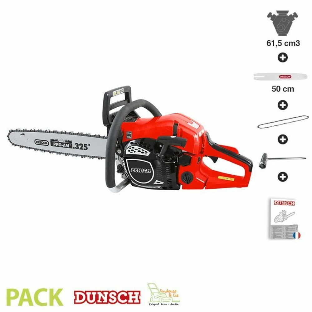 tronçonneuse puissante moteur 2 temps essence dunsch 32615 cylindrée 61,5cm3 50,8 cm3 délivrant une puissance de 3,2 cv.